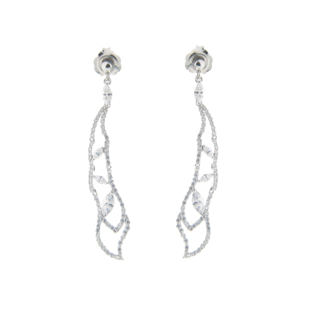 Rock the red carpet look with these glamorous cz chandelier feather drop earrings. Our rhodium plated sterling silver cz teardrop earrings feature brilliant clear white cubic zirconia stones. Buy these drop earrings for your wedding day and give them out as bridesmaid gifts. For pierced ears only.