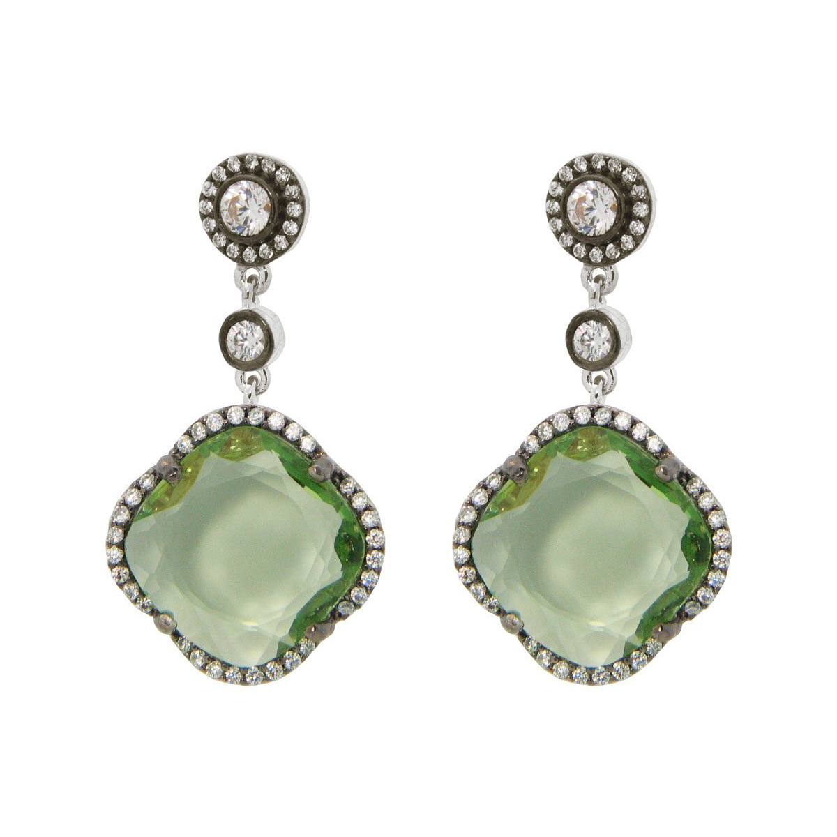 Women's Green Zirconia Stone Clover Dangle Earrings CZ Border Black Rhodium Flashed Sterling Silver