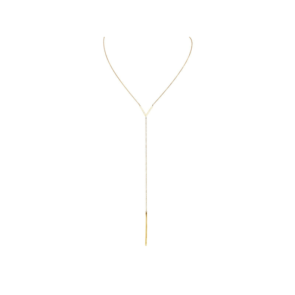 This lariat necklace features a silver Y-shaped design with a .08 carat cz embellished lariat bar. Hanging 5 inches down is a simple vertical gold bar pendant. At the top sits a glamorous cz infused V. This necklace will compliment your look and style perfectly.