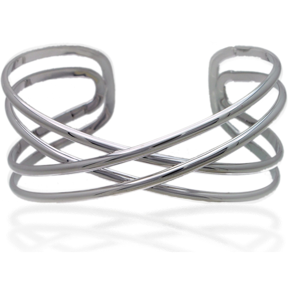 AB015 - Modern, double criss cross bangle cuff bracelet. This bracelet is made with sterling silver and is rhodium plated for carefree maintenance. All of our bangles measure 7 1/2 inches and are easily adjustable to fit a seven or eight inch wrist without harming the integrity of the bracelet.
